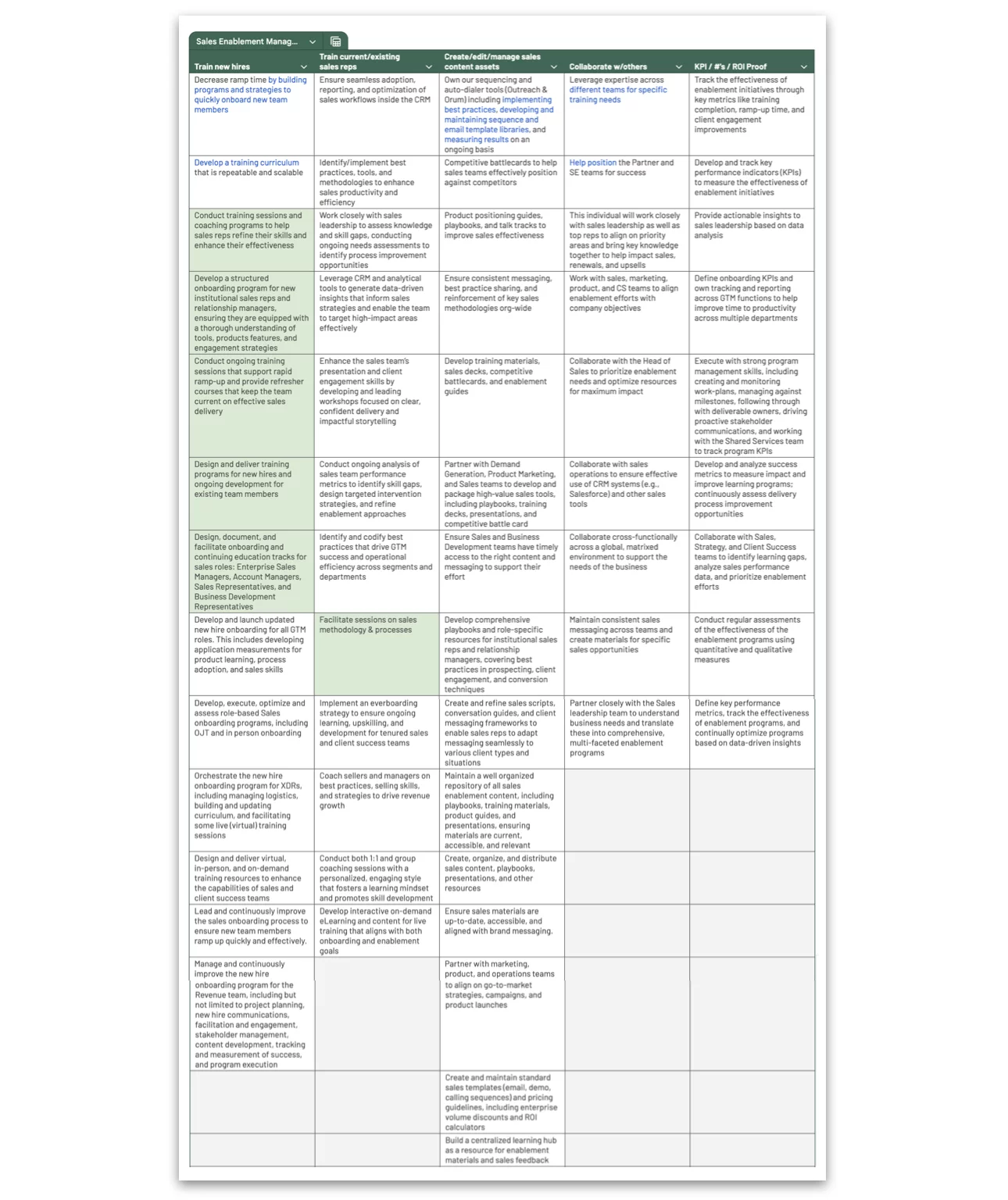 I analyzed 50+ current SE MGR job descriptions recently and these are the top 3 jobs people want sales enablement for.